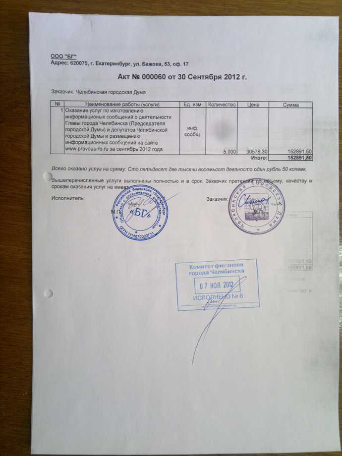 Настоящие бумаги не соответствуют требованиям, предъявляемым законодательством к актам выполненных работ. Челябинская городская Дума не имела права перечислять бюджетные средства в отсутствие надлежащим образом оформленной и подписанной документации.